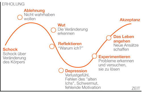 Nach der Operation sind Sie vielleicht von Trauer überwältigt, weil Ihr Körper nicht mehr derselbe ist. Bei einer allmählichen Gewöhnung an Ihre neue Situation gibt es mehrere emotionale Phasen, die Sie durchlaufen können (siehe Grafik unten). Diese „Phasen der Trauer“ können in jeder beliebigen Reihenfolge auftreten, sie können in Wellen wiederkehren und sie werden sich mit zunehmender Akzeptanz an die neue Situation abschwächen. Kenntnis über diese Phasen kann Ihnen helfen, Ihre Gefühle und die emotionalen Wellen zu verstehen, z. B. wenn Sie plötzlich nach einer „guten“ Zeit einen „schlechten“ Tag erleben.